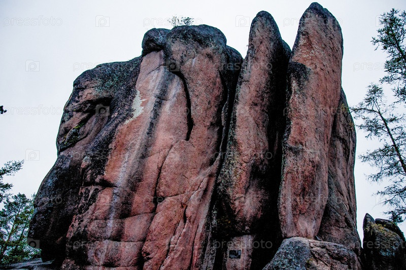 ландшафт сибирских гор Столби, пик горы Перия в тумане лета