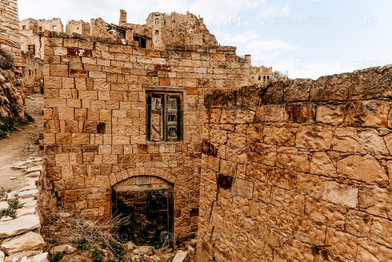 Крепость Аул Гамсутль в старом городе, старая каменная достопримечательность, пейзаж укрепления здания, Дагестан, Россия