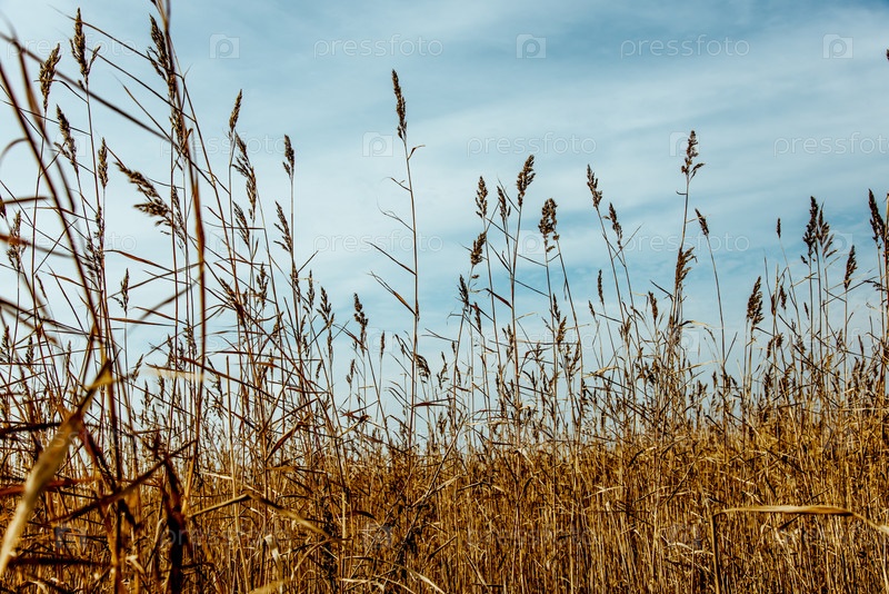 Сухое желтовато-золотое тростниковое растение трава сорняки растет на берегу водоема озера моря за пределами ландшафта