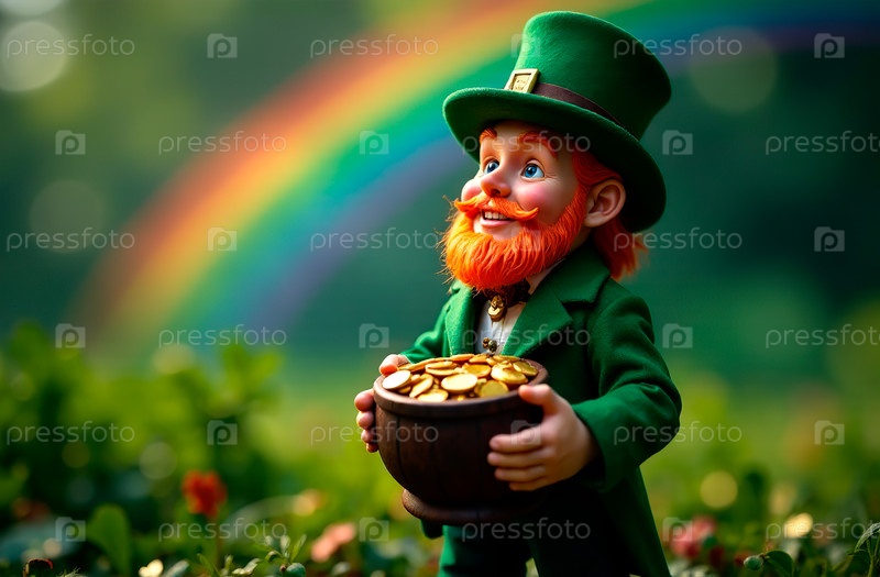 AI Generative Leprechaun в зеленом костюме с горшочкой золота стоит в лесу против радуги