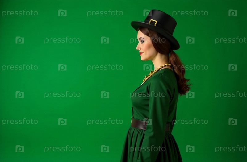 Женщина в традиционном ирландском зеленом костюме и шляпе стоит на зелёном фоне. Карта Дня Святого Патрика