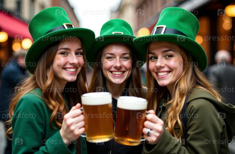Три женщины мигают пивными кружками на Фестивале Святого Патрика