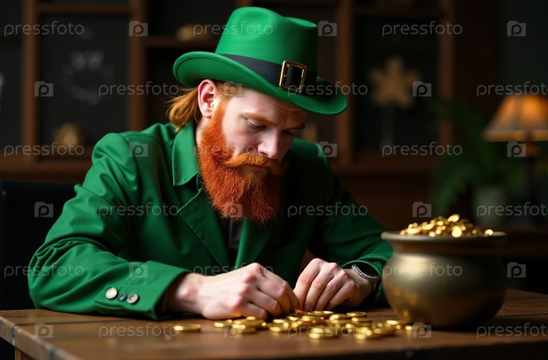 Человек с красной бородой в зеленом костюме, считающий золотые монеты