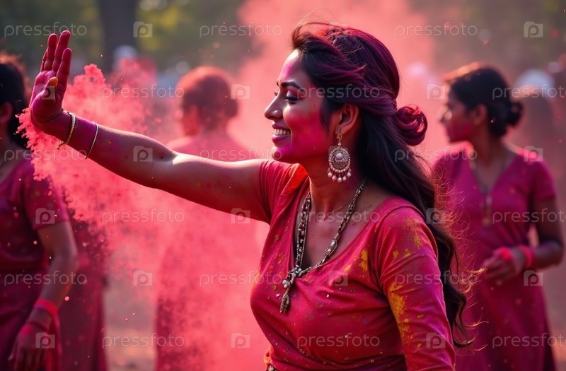 Женщина в брызгах красочного Холи рисует индийский весенний фестиваль