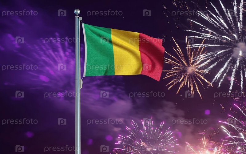 ИИ генеративный национальный флаг независимости государства Мали, фон с фейерверком
