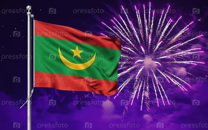 AI generative Национальный флаг независимости Мавритании, фон с фейерверком