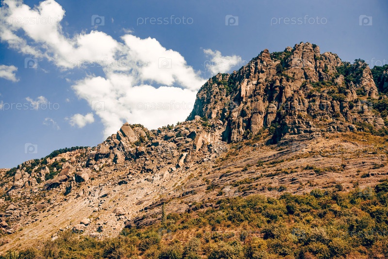 Пейзаж гор Крыма, горный хребет в туманном летом Долина Призраков