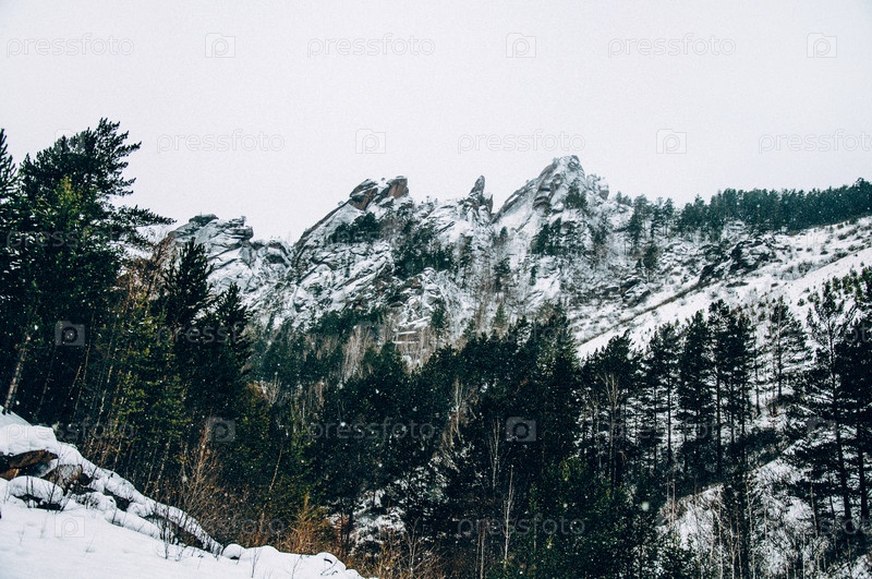 Пейзаж гор Сибири Столби, вершина горы Такмакский хребет в туманную зиму