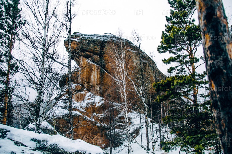 Пейзаж сибирских гор Столби, вершина горы в туманной зиме