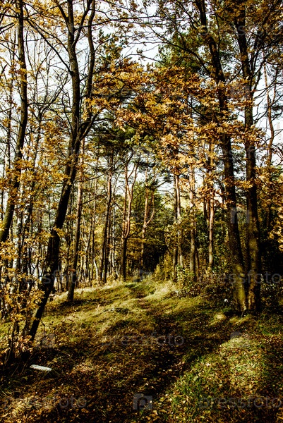 Зеленый летний лесной пейзаж, лесные деревья, трава и облачное небо