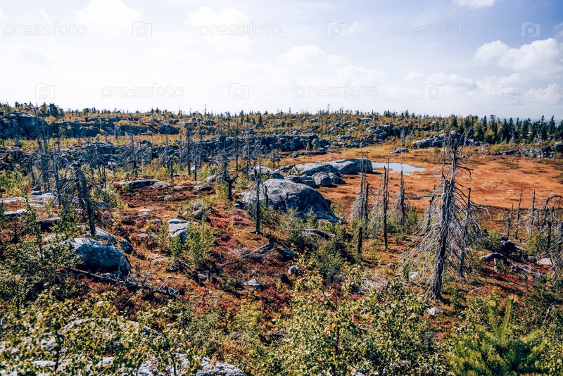 Лес с мертвыми еловыми листопадными деревьями на вершине горы Воттовара Карелия, Россия