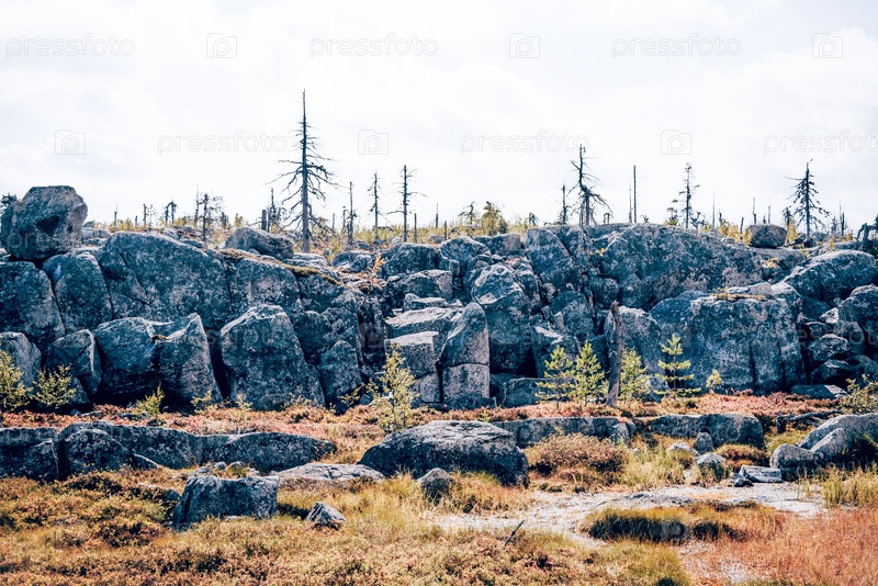 Лес с мертвыми еловыми листопадными деревьями на вершине горы Воттовара Карелия, Россия