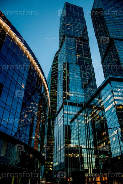 Стеклянные высокие многоэтажные здания Московских городских небоскребов в центре города