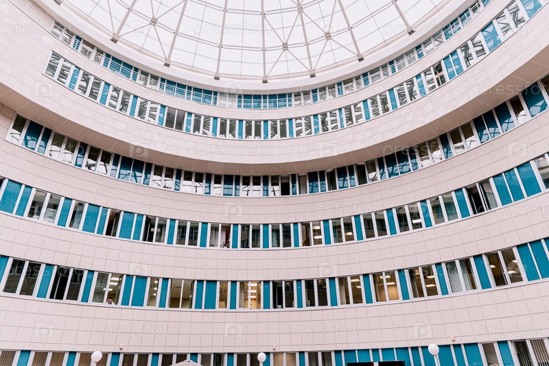 Двор многоэтажного здания интерьер снаружи, стеклянный купол внутри