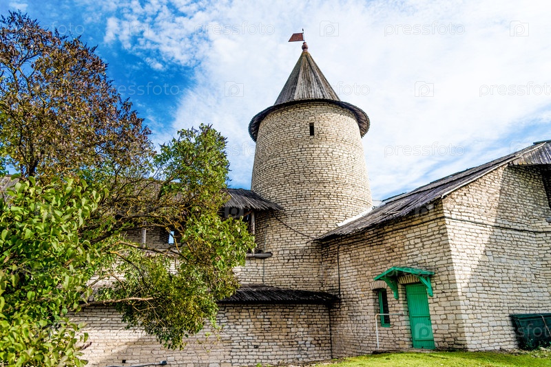 Псковская крепость в старом городе, старая каменная достопримечательность, укрепление здания ландшафтного бастиона, Россия
