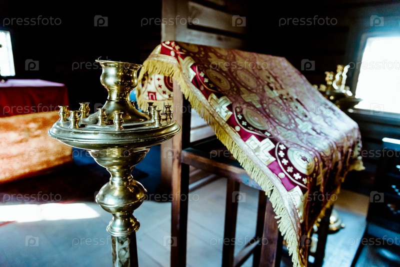Позолоченный подставник для церковных свечей внутри старого православного христианского деревянного храма