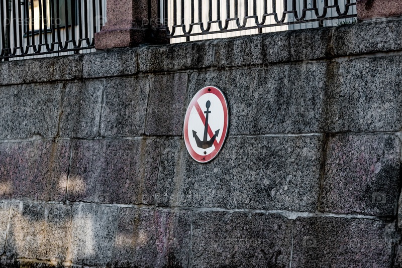 Морской знак, запрещающий якорь в воде висит на набережной Санкт-Петербурга