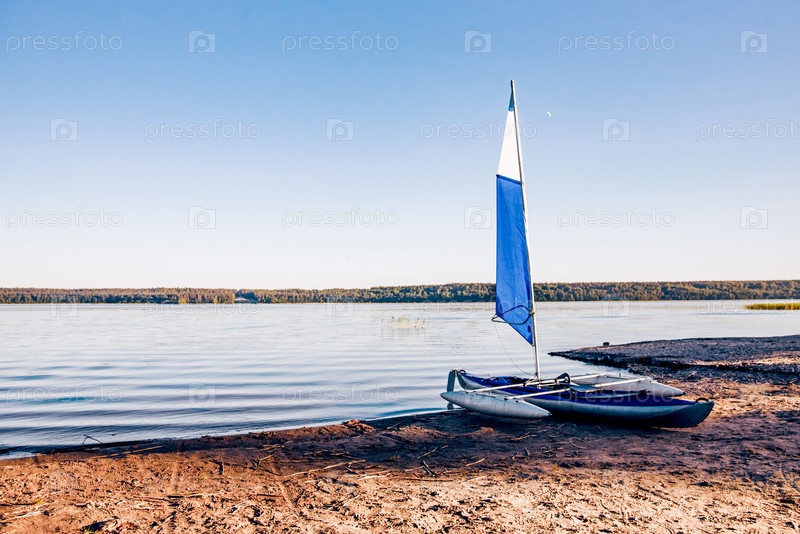Каяковое каноэ с парусом, пришвартованное на берегу озера Ладожского пруда в Карелии, Россия