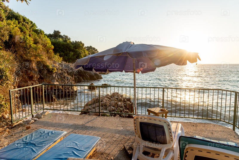 Оборудованный галечный пляж Адриатического моря, пустые шезлонги на закате, Утьяха, Черногория