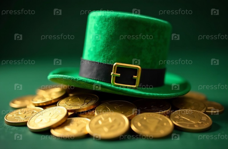 Карточка на День Святого Патрика, горшок золота, шляпа на зеленом фоне