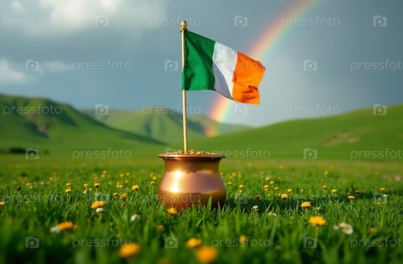 Открытка на День Святого Патрика, Золото из кастрюли, Шляпа, Лепрехаун, Флаг Ирландии