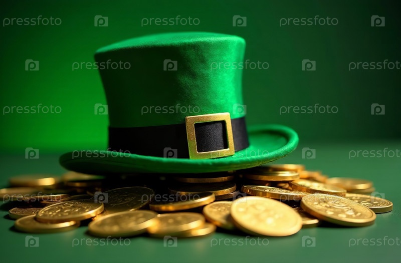Карточка на День Святого Патрика, горшок золота, шляпа на зеленом фоне