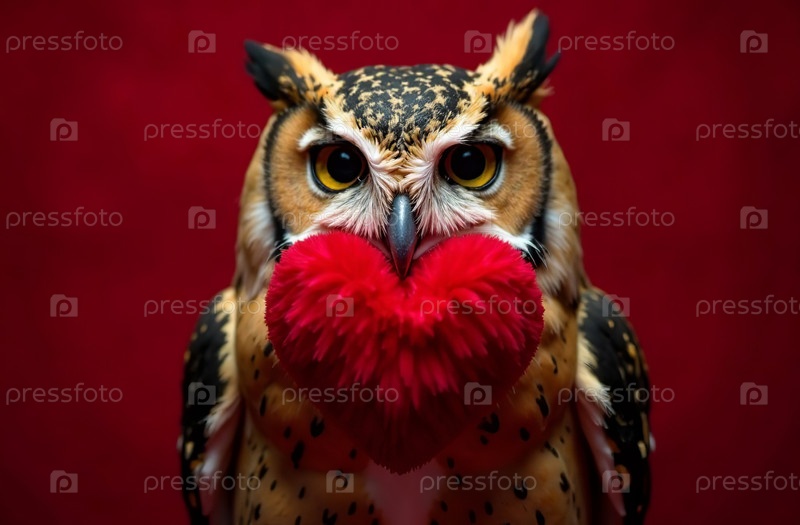 Карта Дня Святого Валентина, сова держит пушистое сердце на красном фоне