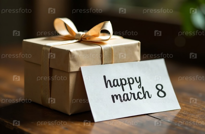 Подарочная коробка с лентой и открыткой на 8 марта на столе