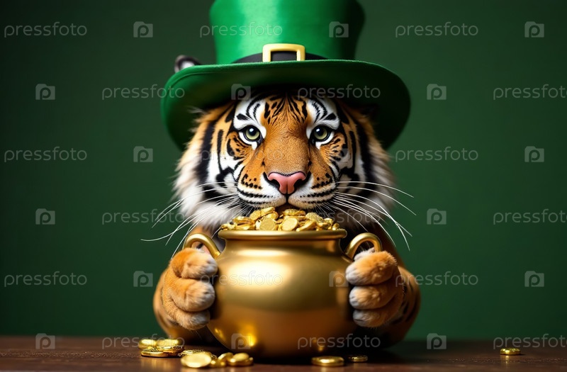 Тигр в традиционном зеленом ирландском костюме с шляпой, открытка на День Святого Патрика