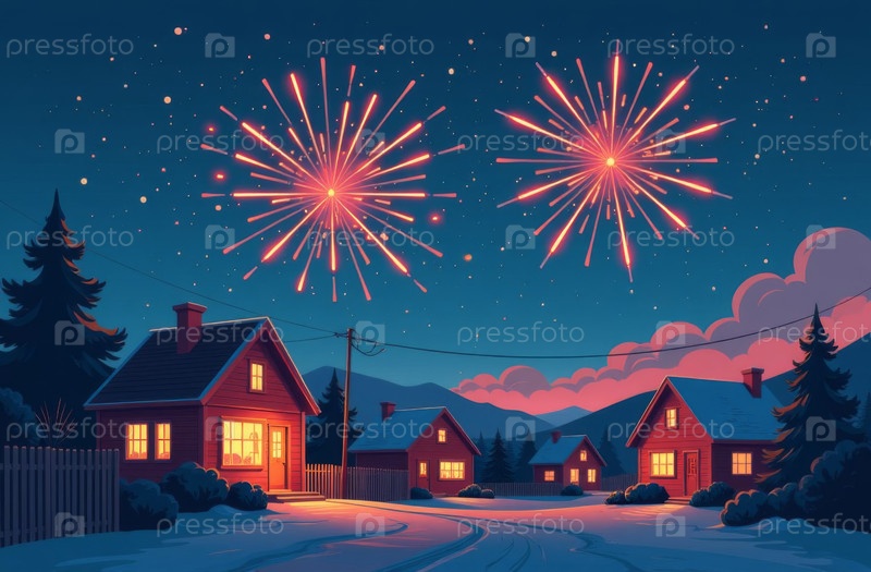 Новогодние фейерверки, пригород, дерево, звездная ночь. искусственно созданные
