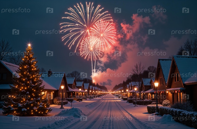 Созданный AI Новогодние фейерверки, пригородные виды, рождественская елка и здание на заднем плане, звездная ночь