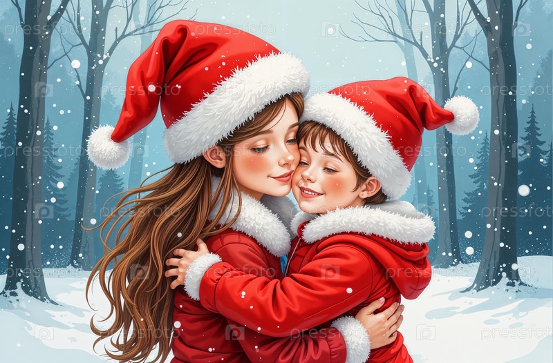 Мама обнимает сына в рождественской шляпе Санта-Клауса возле снежного леса
