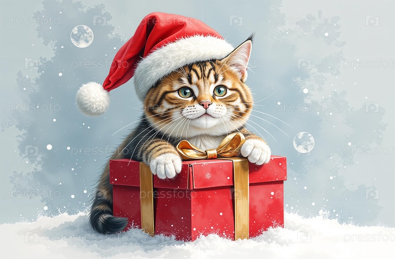ИИ-генерированный новогодний портрет кота в шляпе Санты в подарочной коробке, рождественская открытка с пространством для текста