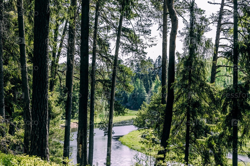 Зеленый летний лес ландшафт зеленых лесных деревьев, травы и облачное небо