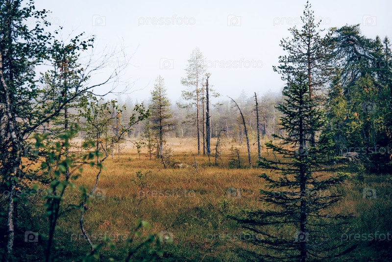 Зеленый лесный ландшафт летнего лета - пихта, трава и облачное небо в Карелии