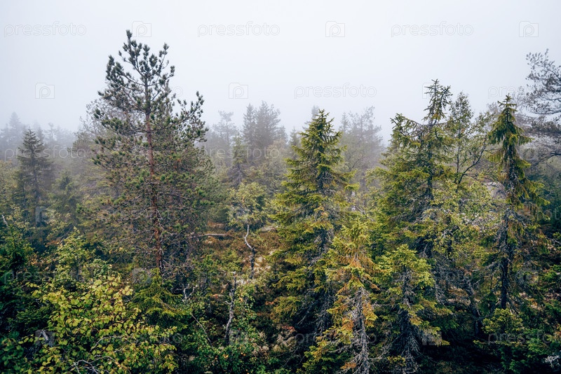 Зеленый лесный ландшафт летнего лета - пихта, трава и облачное небо в Карелии