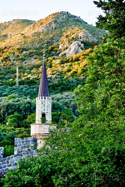 Исламская мечеть минаретный храм в городе Бар в Черногории, вид на горы фон