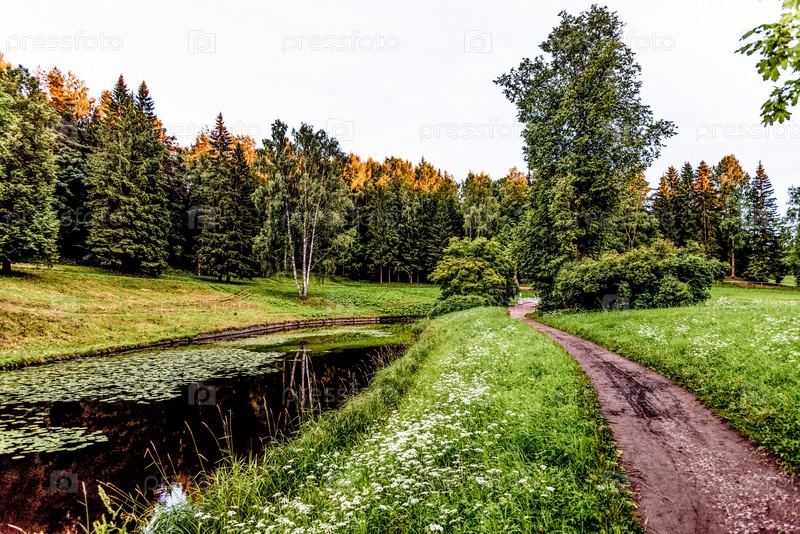 Панорамный пейзаж Павловского парка с деревьями, травой, газоном и тропами осенью