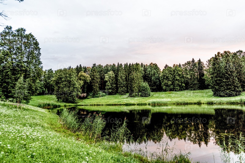 Панорамный пейзаж Павловского парка с деревьями, травой, газоном и тропами осенью