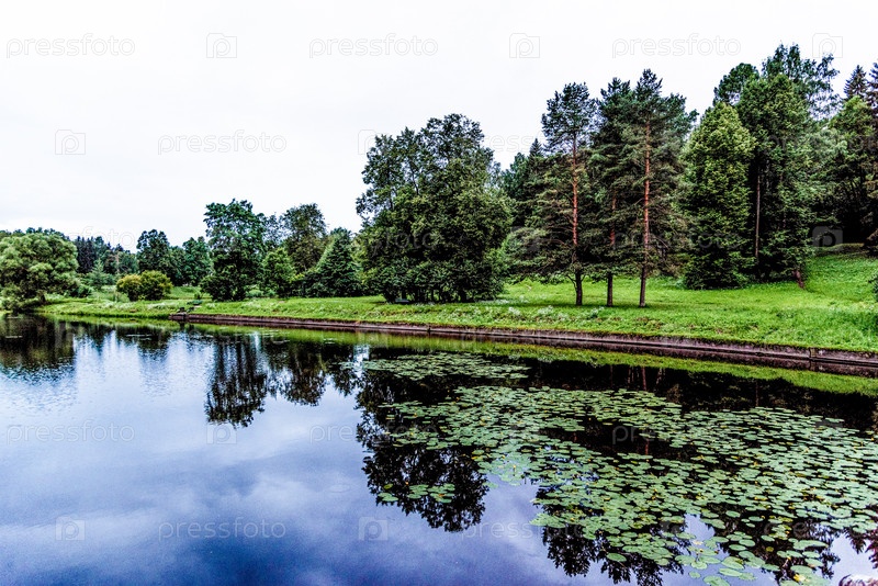 Панорамный пейзаж Павловского парка с деревьями, травой, газоном и тропами осенью