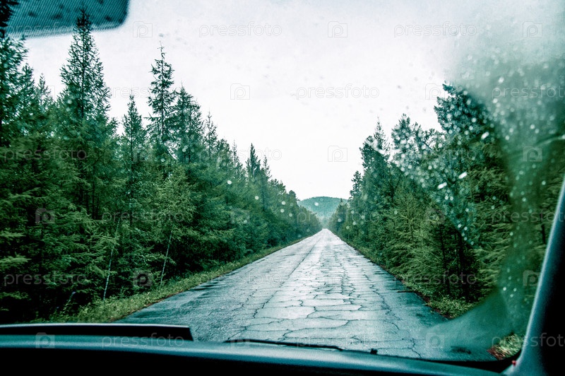 Вид из переднего окна автомобиля на асфальтированную, сломанную пригородную автомагистраль в пасмурный осенний день