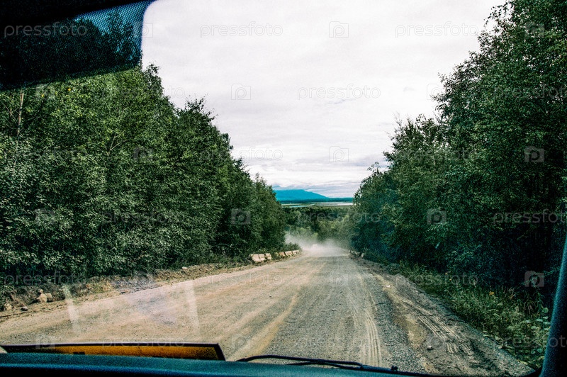 Вид из переднего окна автомобиля на асфальтированную сломанную пригородную автомагистраль