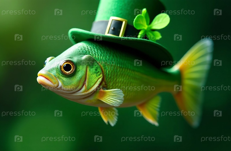 AI Generative Animal Fish в традиционном зеленом ирландском шляпном костюме, открытке на День Святого Патрика