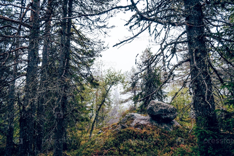 Зеленый летний лесный пейзаж, еловые леса, трава и облачное небо Карелии