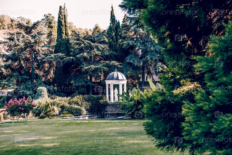 Панорама ландшафта Айвазовского парка в Партените, Крым с деревьями, травой, газоном и тропами в солнечный летний день