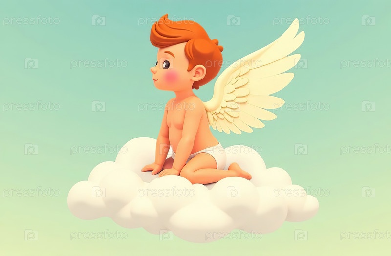 ИИ генеративный ребенок Купидон с лукомом и стрелками, летающими по небу в облаке