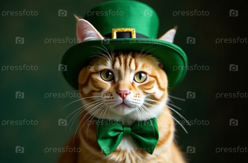 Кошка в традиционном зеленом ирландском костюме с шляпой, открытка на День Святого Патрика