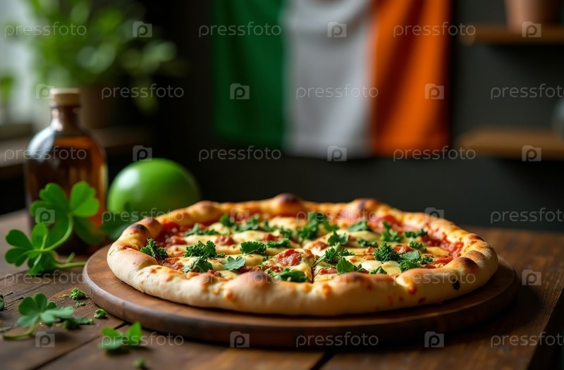 Ирландская пицца на деревянном столе, украшенной ко Дню Святого Патрика