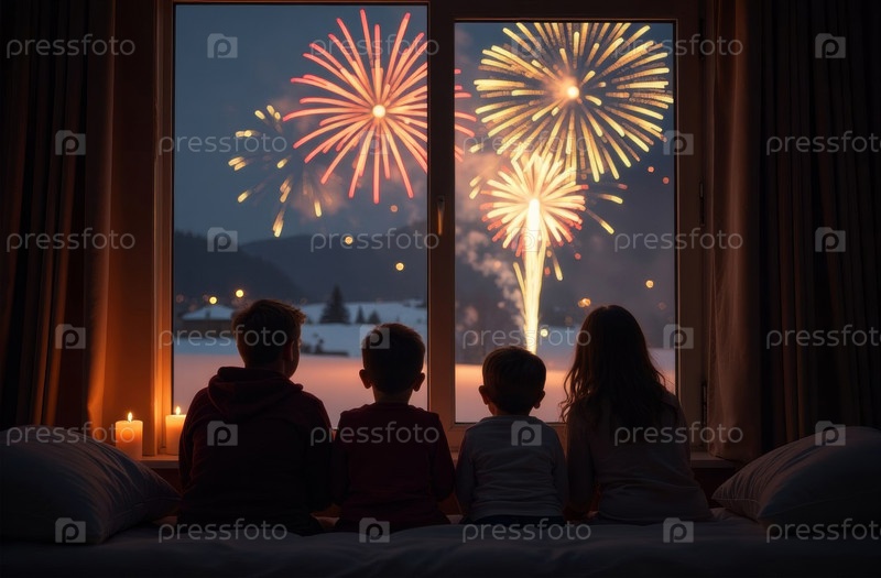 Новогодние фейерверки, люди сидят, смотрят в окно, лес рождественских деревьев. искусственно создан