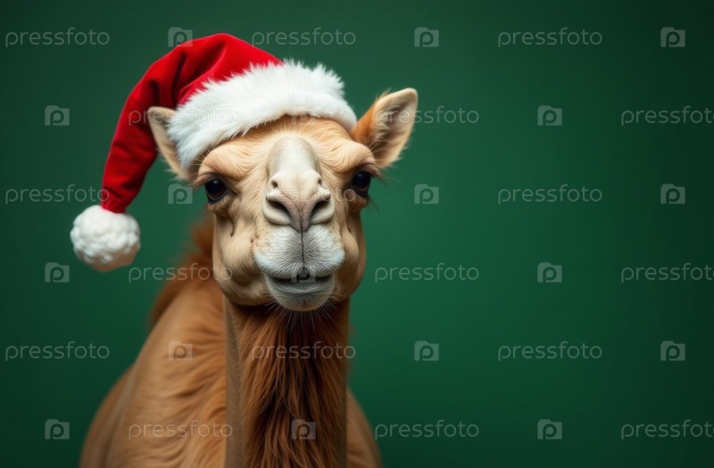 Новогодний портрет верблюда в Санта-Клаусе Hat Green, рождественская открытка искусственно созданная